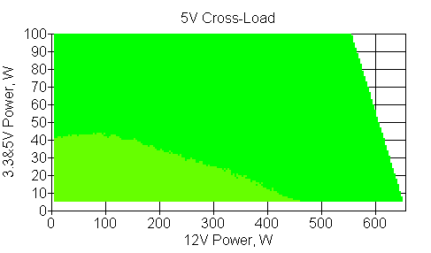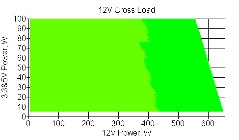 Следующим этапом инструментального тестирования является построение кросснагрузочной характеристики (КНХ) и представление ее на четвертьплоскости, ограниченной максимальной мощностью по шине 3,3&5 В с одной стороны (по оси ординат) и максимальной мощностью по шине 12 В с другой стороны — по оси абсцисс. В каждой точке измеренное значение напряжения обозначается цветовым маркером в зависимости от отклонения от номинального значения.