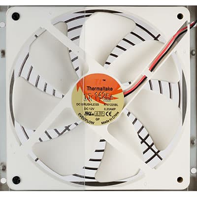 Под вентиляционным отверстием, закрытым проволочной решеткой, установлен нагнетающий вентилятор Thermaltake TT-1425A, ОЕМ-производителем которого является компания Everflow, модель R121225BL. Вентилятор основан на двойном шарикоподшипнике, что должно положительно сказаться на сроке его службы.