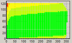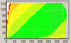 Первым этапом инструментального тестирования является построение кросснагрузочной характеристики (КНХ) и представление ее на полуплоскости, ограниченной максимальной мощностью по шине 3,3&5V, с одной стороны, (по оси ординат), и максимальной мощностью по шине 12V, с другой стороны, — по оси абсцисс. В каждой точке измеренное значение напряжение обозначается цветовым маркером, в зависимости от отклонения от номинального значения: