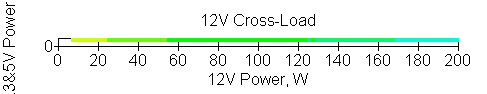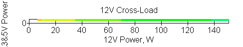 Следующим этапом инструментального тестирования является построение кросснагрузочной характеристики (КНХ) и представление ее на четвертьплоскости, ограниченной максимальной мощностью по шине 3,3&5 В с одной стороны (по оси ординат) и максимальной мощностью по шине 12 В с другой стороны — по оси абсцисс. В каждой точке измеренное значение напряжения обозначается цветовым маркером в зависимости от отклонения от номинального значения.
