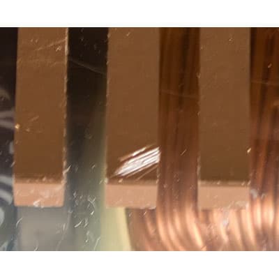 Основные полупроводниковые элементы установлены на двух радиаторах. Несмотря на их рыжеватый цвет, радиаторы полностью алюминиевые, а такой вид придан им с помощью покраски. Правда, не совсем понятно зачем это нужно было делать, так как, по сути, внутренний объем блока питания не доступен для пользователя, так как на одном из винтов, фиксирующих крышку, установлена бумажная пломба. В доказательство наших слов приводим фотографию радиатора немного поцарапанного при помощи ножа. На ней хорошо виден серебристый металл на месте повреждения слоя краски.