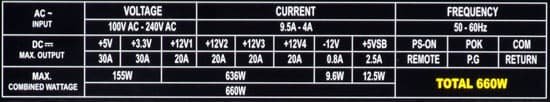 Проанализировав характеристики тестируемой модели можно прийти к выводу, что они вполне справедливы для блока питания мощностью 660 ватт. При этом, мощность шины +12VDC выше на 12 ватт (1А), чем требует того стандарт для блоков питания мощностью 650 ватт. Суммарная мощность каналов 3,3&5V - 155 ватт вполне соответствует требованиям стандарта для блоков питания настольных систем ATX12V. Тот факт, что данная мощность ниже требований стандарта для блоков питания серверных систем EPS12V не должен кого-либо смущать, так как набор комплектующих и задачи выполняемые серверными системами заметно отличаются от аналогичных у настольных систем, поэтому данные типовых блоков питания из спецификации EPS12V мы используем только для оценки мощности шины +12VDC.