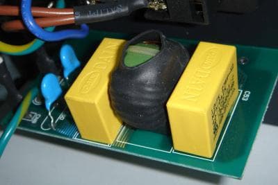 На представленных фотографиях внутренней части ИБП хорошо виден встроенный сетевой фильтр, он состоит из внушительного сглаживающего дросселя, который, совместно с противопомеховыми конденсаторами и защитными варисторами, обеспечивает защиту от промышленных и индустриальных помех.