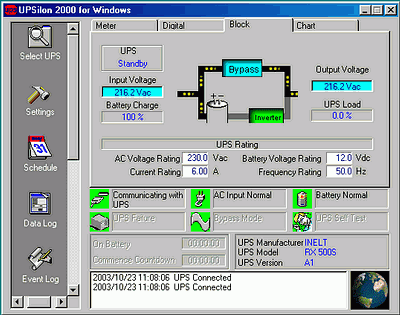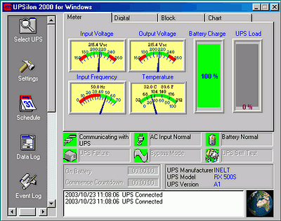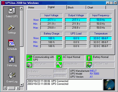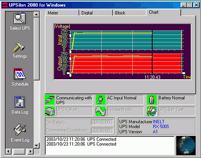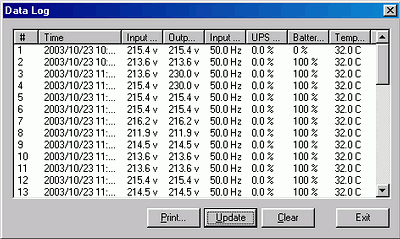 При работе управляющего ПО протоколируются все происходившие события, например, отключение/восстановление питания, проведение тестирования ИБП и др., а также ведется журнал изменения напряжения входного/выходного питания, температуры ИБП, изменения уровня заряда аккумулятора: