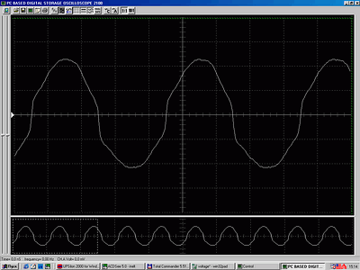 А теперь отключим кабель питания ИБП от ЛАТР и заставим объект эксперимента питать нагрузку только от аккумулятора (мощность нагрузки — 250 Вт, что, по данным ПО, составляет 95%, а по паспортным характеристикам ИБП — 100%, поскольку его выходная мощность 500 ВА, cos ф=0,5).
