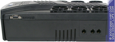 На правой боковой панели (если смотреть со стороны кнопки питания) расположены разъем RS-232 для подключения управляющего кабеля, один вход и два выхода RJ-11 (для телефона/факса).