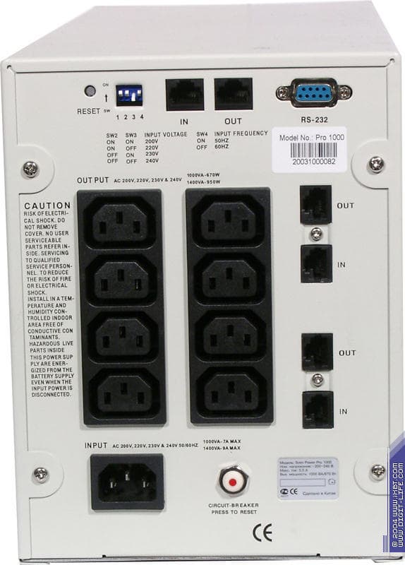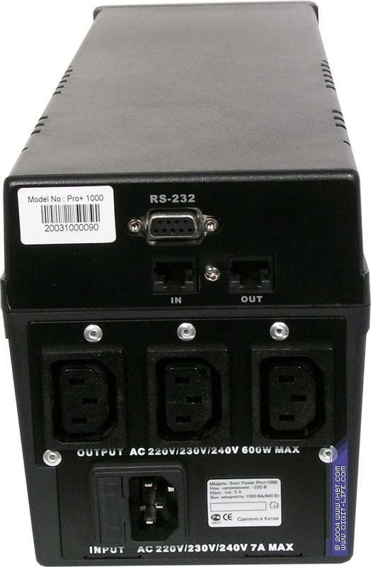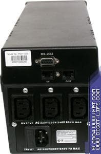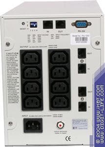 На задней панели расположены разъем RS-232 для подключения управляющего кабеля, один вход и выход RJ-45 (у старшей модели, Pro 1000, пар вход-выход три) для защиты входа сетевой карты от помех, розетки IEC-320 (три у модели Pro+ 1000 и восемь у Pro1000) для подключения нагрузки, розетка питания самого устройства. У Pro 1000, ко всему прочему, предусмотрена кнопка разрыва цепи, 4 DIP-переключателя, устанавливающие номинал входного напряжения, и кнопка сброса ИБП.