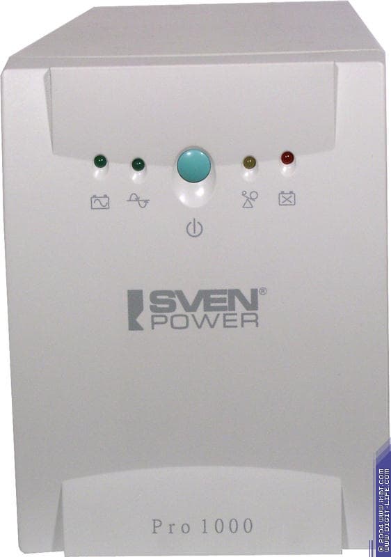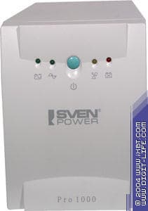 Как Sven Pro 1000 и Sven Pro+ 1000 имеют стандартную, «классическую» для ИБП вертикального размещения компоновку; на передней панели — кнопка включения/выключения/тестирования ИБП, четыре светодиодных индикатора: питание от сети, питание от аккумулятора, неисправность аккумулятора, перегрузка.