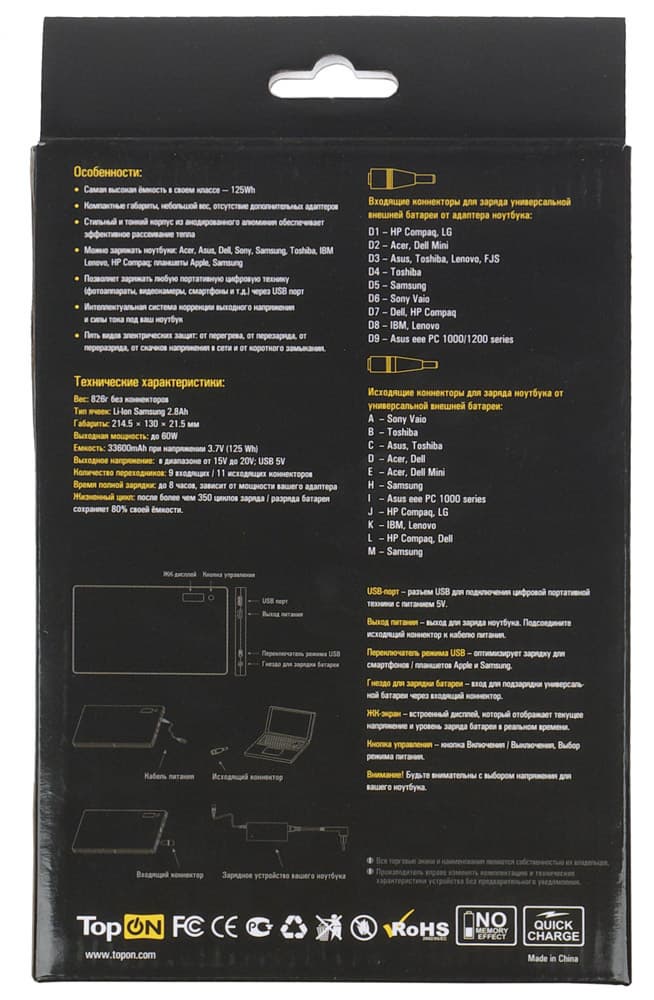 Как видите, помимо вполне конкретных значений выходного напряжения есть и диапазоны, сопровождаемые словом «Auto» — например, «19 V, Auto 18-20 V», а в инструкции и на упаковке есть фраза «Интеллектуальная система коррекции выходного напряжения и силы тока под ваш ноутбук». Ну, про силу тока явно немножко загнули — ноутбук потребит ровно столько, сколько требуется ему в данный момент, и тут возможен лишь один вариант: максимальный ток внешней батареи меньше, чем нужно для питания ноутбука в каком-либо режиме работы с высоким энергопотреблением, и тогда возможны нехорошие варианты вплоть до отключения Top-Max из-за срабатывания защиты по току, однако вряд ли это можно назвать «интеллектуальной коррекцией».