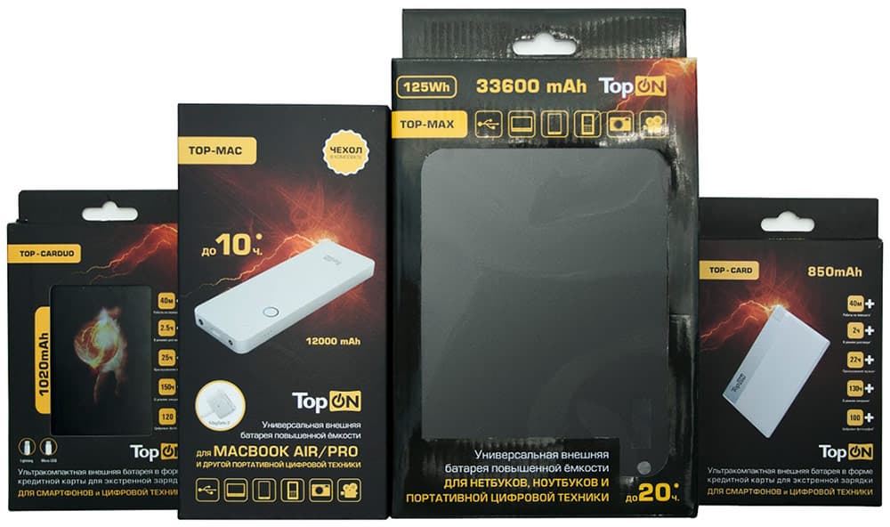 Батареи относятся к разным категориям: Top-Mac и Top-Max предназначены для резервного питания целого спектра устройств с различными потребляемыми мощностями и входными напряжениями, а возможности применения Top-Card и Top-Carduo ограничены смартфонами и иными устройствами с 5-вольтовым питанием и относительно небольшим потребляемым током.