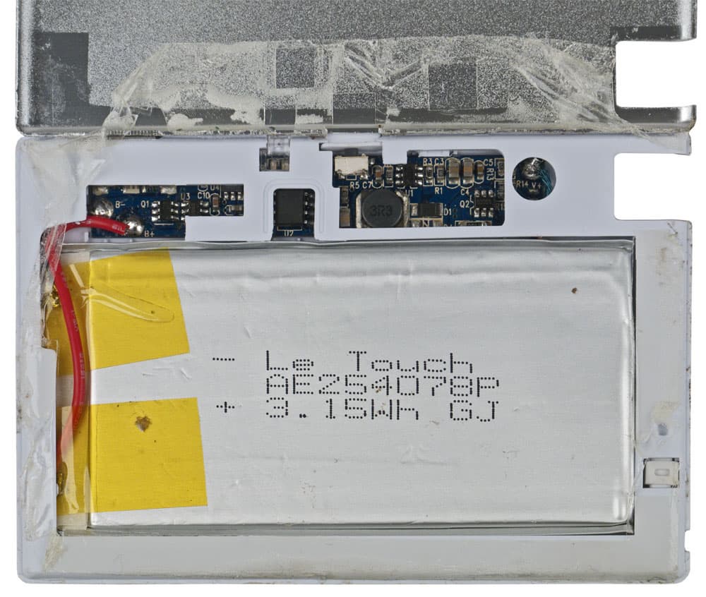 Вскрыть корпус этой батареи у нас получилось, и мы сделали фото, уточним: используется аккумулятор Le Touch AE254078P 3,15 Wh GJ (с учетом напряжения ячейки в 3,7 В это и есть заявленные 850 мА·ч).