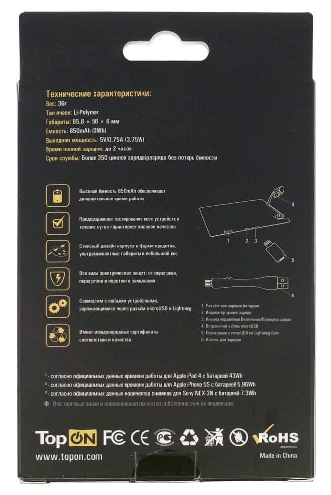 Про эту модель долго рассказывать и нечего. В комплекте есть лишь коротенький 18-сантиметровый кабель USB–Micro-USB, который используется для заряда Top-Carduo. Соответственно на одном из торцов батареи есть гнездо Micro-USB, а рядом с ним находится крошечная кнопка включения.