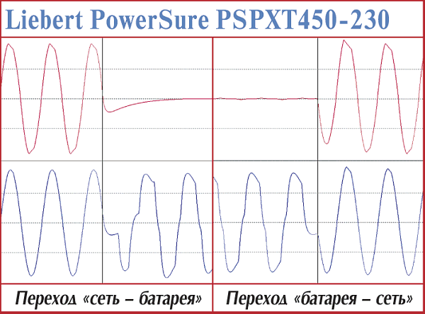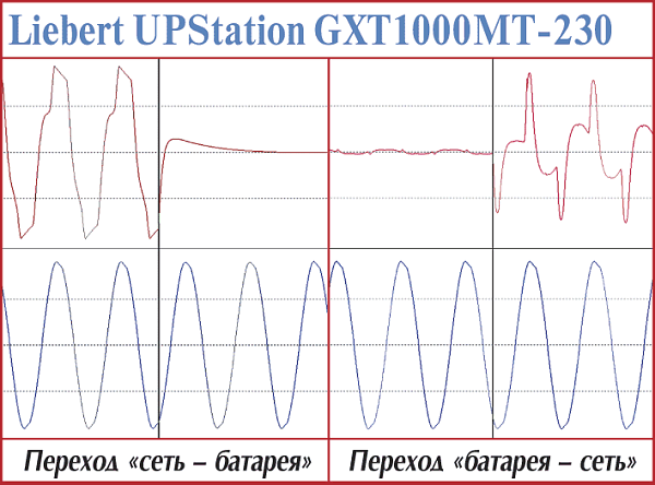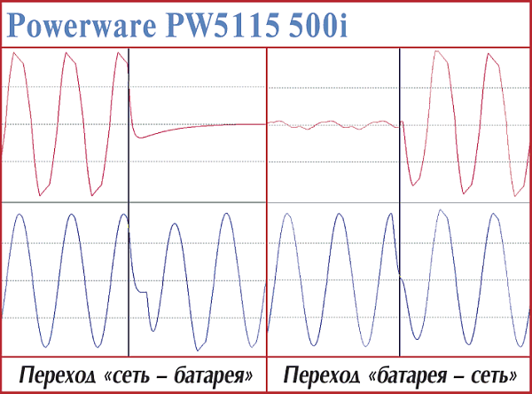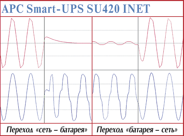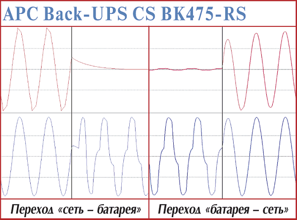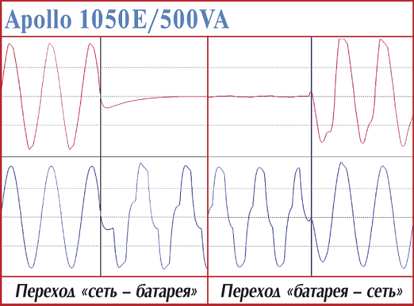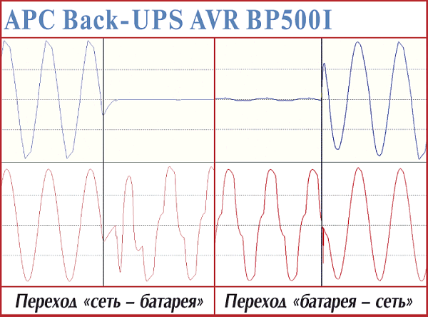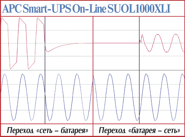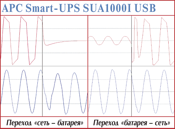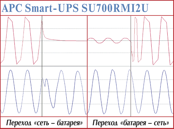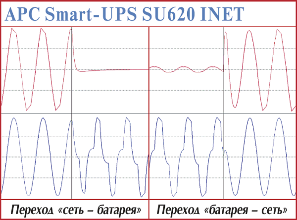 Эти модели — наиболее простые в серии APC Smart-UPS. В первую очередь это проявляется в прямоугольной форме выходного напряжения при работе от батарей. Установление процессов при переходе на питание от батарей — 4—5 мс. Точно установить время возврата у этих моделей cложно — обе достаточно долго готовятся (более 1,3 с), но быстро заканчивают (менее 1 мс).