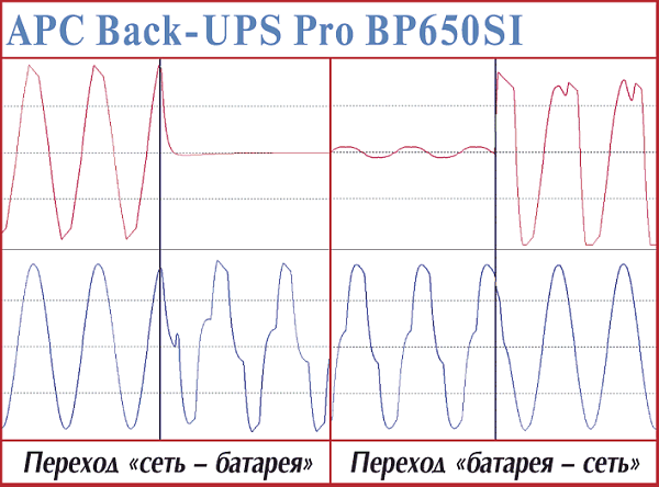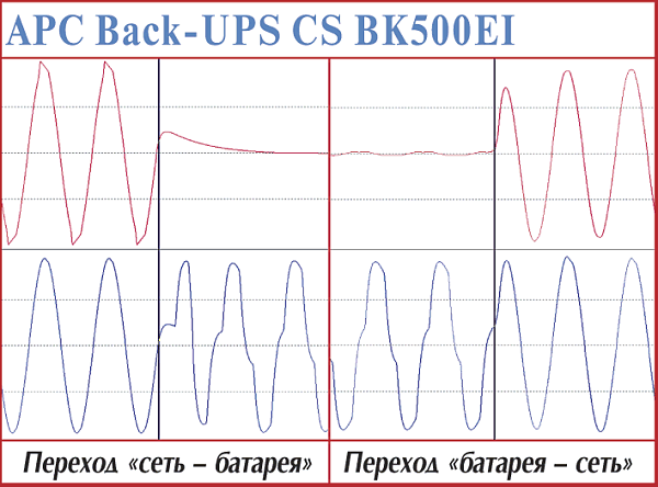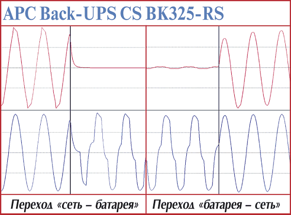 Эта серия устройств пришла на смену Back-UPS CS и призвана защищать нагрузку в наших условиях хронических аномалий питающей сети, когда предыдущие источники бесперебойного питания либо постоянно переключались с сети на батарею, либо игнорировали снижение напряжения в пределах выше разумного. Что касается исследуемых нами временных интервалов, то для перехода на батарею они остались практически без изменений — 4 мс. Сам переходной процесс при возврате ИБП на сеть продлился менее 1,8 мс.