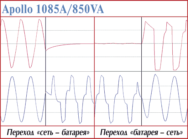 Казалось бы, что относиться к этому устройству следует, как к «старшему брату» предыдущей модели. Однако на деле выяснилось, что у него абсолютно противоположный характер. Только у Apollo 1085A при работе от сети выходное напряжение находится в противофазе к сетевому, что сразу привлекло наше пристальное внимание к нему. Прямой переход на батарею выполнялся довольно корректно, но недостаточно, на наш взгляд, быстро — 8 мс. Время возврата на питание нагрузки от сети (с момента подключения входного напряжения) составило 1,24 с, однако сам переходной процесс и тут оказался затянутым — он завершился полностью через 9 мс, причина все та же — прежде чем подключать сеть, необходимо отключить инвертор от выходных гнезд и подождать некоторое время «про запас». В общем, после того как мы еще немного «погоняли» его в разных режимах, впечатление о нем сложилось, как о достойном «китайце для бытового ПК» с немного завышенной (судя по названию) мощностью инвертора и достаточно «жесткой» (импульсной) формой потребляемого тока.