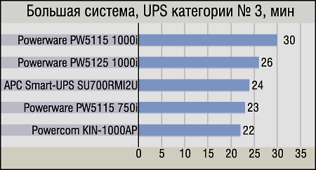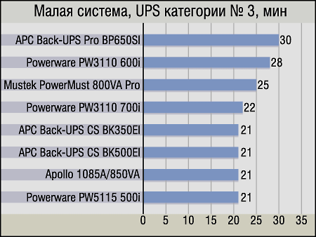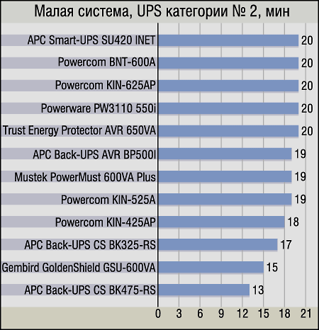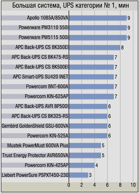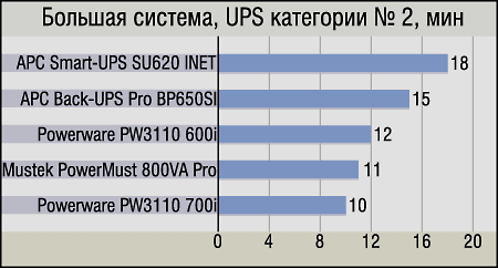 Выделять «чемпиона» в данной группе нам показалось излишним, так как здесь собралось достаточное количество ИБП, которые, положа руку на сердце, также трудно рекомендовать для мощных компьютеров. Да, они «смогли сделать это» — за что честь им и хвала, однако владелец ПК подобной конфигурации вряд ли уже настолько стеснен в средствах, чтобы приобретать ему в пару что-нибудь типа APC Back-UPS CS BK325-RS — устройство хорошее, но предназначенное для несколько иного класса машин. Поэтому, несмотря на кажущуюся парадоксальность такого подхода, мы бы рассматривали данную диаграмму как список UPS для малых систем, дополнительно подтвердивших свои положительные качества, «вытянув» вполне существенное время и большой компьютер.