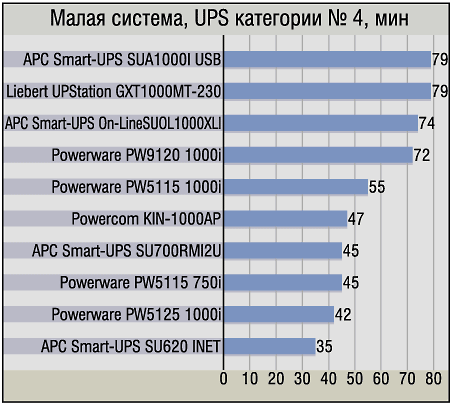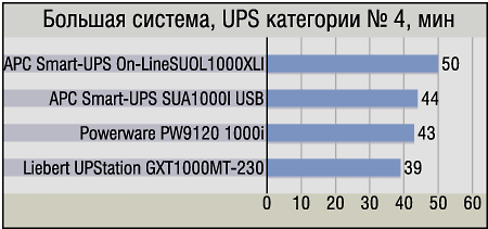 И снова, как и в случае с малой системой, в этой категории мы наблюдаем почти полное господство On-line UPS. В принципе, результаты в чем-то похожи, поэтому перечислим отличия. Если сравнивать показатели UPS четвертой категории на малой и большой системе между собой, то заметно, как резко вырвался вперед ранее находившийся «в числе прочих» APC Smart-UPS On-Line SUOL1000XLI. А вот Liebert UPStation GXT1000MT-230, наоборот, несколько «просел» от увеличения нагрузки. Ну и по-прежнему нельзя не отметить превосходный за свою цену продукт APC — APC Smart-UPS SUA1000I USB. Да, это единственный не-On-line UPS в этой группе, но время работы и мощность делают его вполне достойным конкурентом более дорогих устройств там, где нужды в On-line UPS нет.