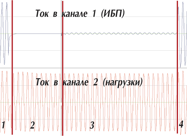 Вторая группа тестов потребовала изготовить небольшой специализированный стенд. Основной инструментальной проблемой стало то, что фиксация переходных процессов осуществлялась на осциллографическую плату ПК, причем между корпусом измерительных цепей и исследуемой цепью нужно было обеспечить качественную гальваническую развязку. В окончательном варианте стенд представлял собой коммутатор с цепями временной синхронизации и два измерительных канала. В комплекте с осциллографом он позволил фиксировать формы потребляемого тока и напряжения на входе и выходе ИБП.