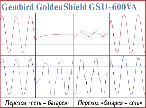 На переход с сети на батарею потребовалось около 5 мс. После восстановления питания ИБП «задумался» на 1,5 с, затем не совсем аккуратно, хотя и быстро, за 1 мс, подключил нагрузку к питающей сети. В общем, типичный представитель low-end (по мощности и емкости) ИБП с довольно хорошими (опять-таки, именно для своего класса) характеристиками.
