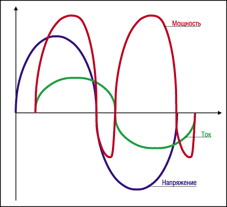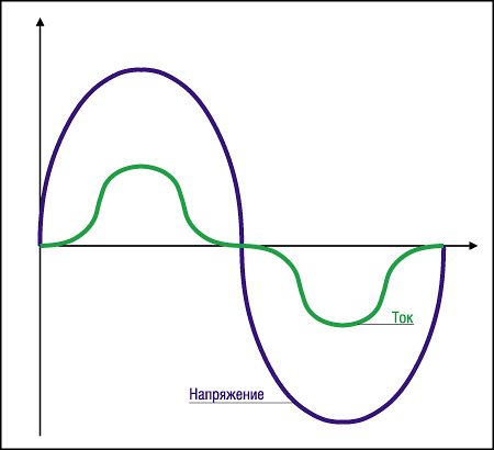 При наличии только линейных искажений на графиках синусоидальная форма колебаний сохраняется, однако наблюдается сдвиг фазы между кривыми тока и напряжения на определенный угол. На практике нагрузка часто вносит как линейные, так и нелинейные искажения.