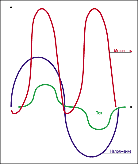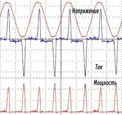 Однако, если импульсный блок питания был спроектирован без учета мер по повышению коэффициента мощности, то величина PF может опускаться и ниже 0,65 (т. е. как для обычных двухполупериодных выпрямителей).