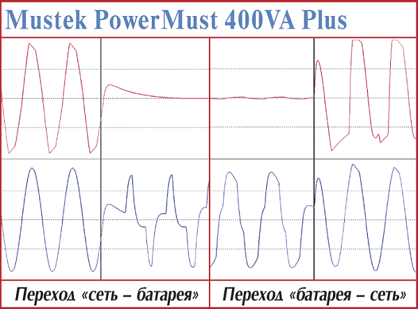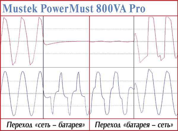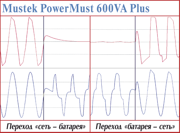 ИБП под маркой Mustek — новичок как на отечественном рынке, так и в нашей лаборатории. Анализируя осциллограммы работы, мы заметили, что процесс возврата на сеть происходит пусть и быстро, но всегда недостаточно корректно — в момент далеко не нулевого значения питающего напряжения. Подобную «стабильность» можно объяснить только особенностями схемотехнического исполнения устройства. Немного меньшей величиной этого «провала» отличился тестовый экземпляр PowerMust 800VA Pro. И навязчиво преследовала мысль: «Где-то подобную характеристику мы уже видели…».