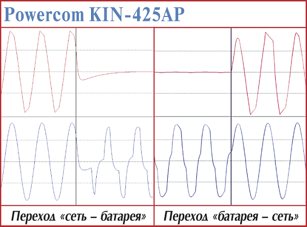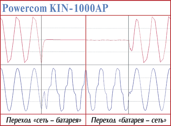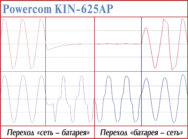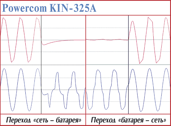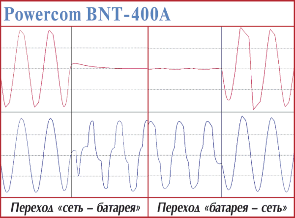 В общем, временные параметры переходных процессов этих ИБП — «самые, что ни на есть, средние». Устройство, достойное стать защитником домашнего компьютера начального уровня. Относительно Powercom KIN-325A и BNT-400А было замечено, что, хотя время реакции на пропадание сети в сумме со временем на запуск преобразователя достаточно невелико, но оно может отличаться почти в три раза (от 3 до 8,5 мс) в зависимости от того, на какую фазу периода приходится отключение питания и какой мощности нагрузка подключена.