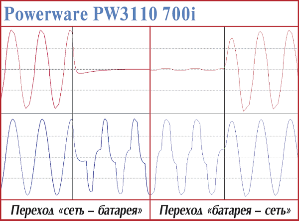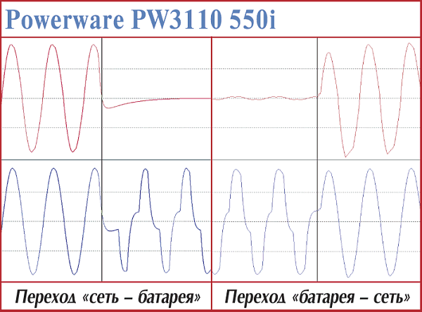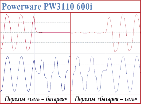 Данные ИБП внешне выглядят как близнецы-братья и отличаются в первую очередь емкостью 12-вольтовых батарей, которая у старших моделей (600i, 700i) составляет 9 Аoч, у 500i — 7,2 Аoч и у младшей — 4,2 Аoч, что позволило производителю на треть уменьшить толщину последней. Такое же «единство взглядов» устройства, в общем, продемонстрировали при прямом и обратном переходах с питания от батарей: 4—6 мс и 1,3 мс для старших и 2,5 и 3,2 мс соответственно для PW3110 250i. Заметим, что время и характер перехода для Off-line ИБП — одно из самых лучших.