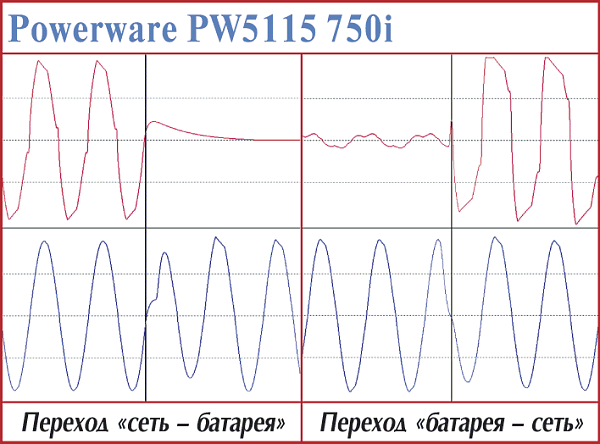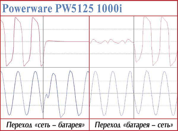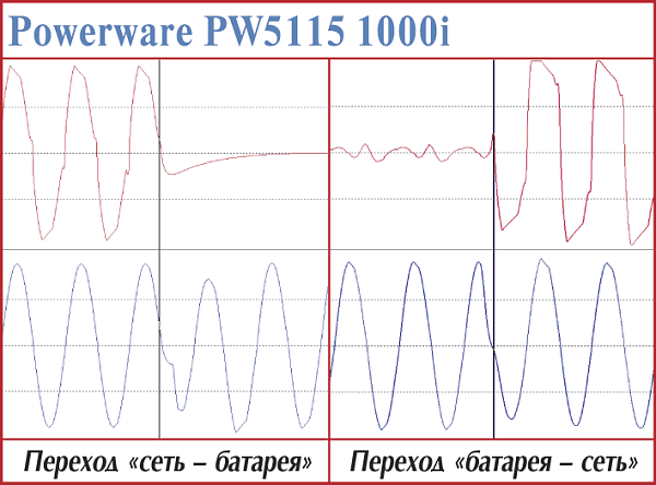 Это одна из самых новых моделей линейно-интерактивных ИБП, позиционируемая для защиты офисных серверов. В отличие от моделей PW5115 700i, у 1000i — на эпюрах переходов никаких всплесков — «все как по маслу». И время перехода на батарею малое — 2 мс, и решение о возврате на сеть принято быстро (610—620 мс), да и сам переход обратно практически молниеносен (1,6—1,8 мс), причем строго привязан к «нулю» сетевого напряжения. И даже уровень гармоник выходного напряжения непривычно низкий. Казалось бы — удачное конструкторское решение, одни достоинства… Все так, если бы не результаты тестов на продолжительность работы…