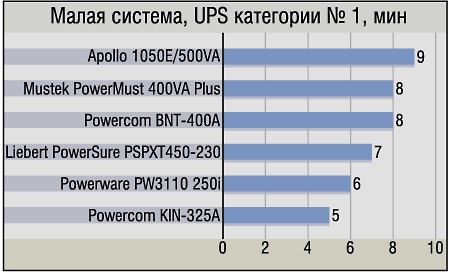 В нее вошли ИБП Apollo 1050E/500VA, Mustek PowerMust 400VA Plus, Powercom BNT-400A и KIN-325A, а также Powerware PW3110 250i. А вот на диаграммах их результатов нет, и по понятной причине: такого «издевательства», как подключение к компьютеру с высокой потребляемой мощностью, их «тонкие души» просто не выдержали — время работы составило менее минуты. Соответственно, единственный вывод, который можно сделать из продемонстрированного ими результата, — для мощных компьютеров они не предназначены в принципе. Примерно к той же категории можно отнести и попавшие на диаграммы Liebert PowerSure PSPXT450-230 и Powercom KIN-425AP: их присутствие в первой категории является в данном случае не рекомендацией к использованию, а скорее, «медалью за героизм».