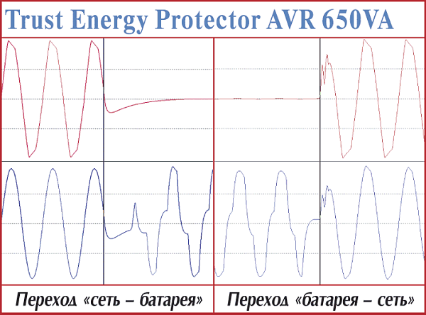 Удивительно, что достаточно высокая оценка, полученная в тестах на продолжительность, не совсем увязывалась с нашими представлениями в ходе исследования конкретного экземпляра на стенде: после отключения питания устройство нормально перешло в режим работы от батарей (5 мс). Однако реакция на восстановление сетевого напряжения несколько озадачила: вначале была «взята пауза» более чем на 2 с, затем наблюдалось 2—3 всплеска как по потребляемому току, так и по выходному каналу. В результате, говорить о корректности обратного перехода не приходится. Но ведь как-то работает?…