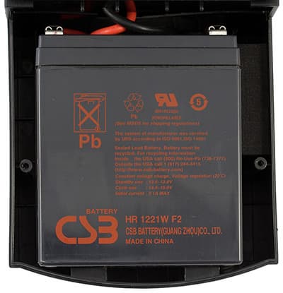В ИБП применяется аккумулятор CSB HR 1221W производства тайваньской компании CSB. Его ёмкость — 5 Ач, рабочее напряжение — 12 В. Батареи этой серии рассчитаны на интенсивный разряд в течение 15 минут. Выбор батарей данной серии является правильным, для типичных условий работы ИБП.
