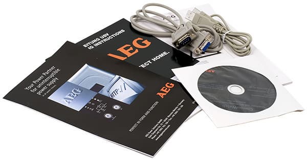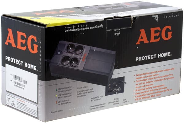 ИБП поставляется в коробке, оформленной в фирменных цветах AEG. Размер упаковки 370 × 190 × 155 мм, вес запакованного комплекта — около 4 Кг.