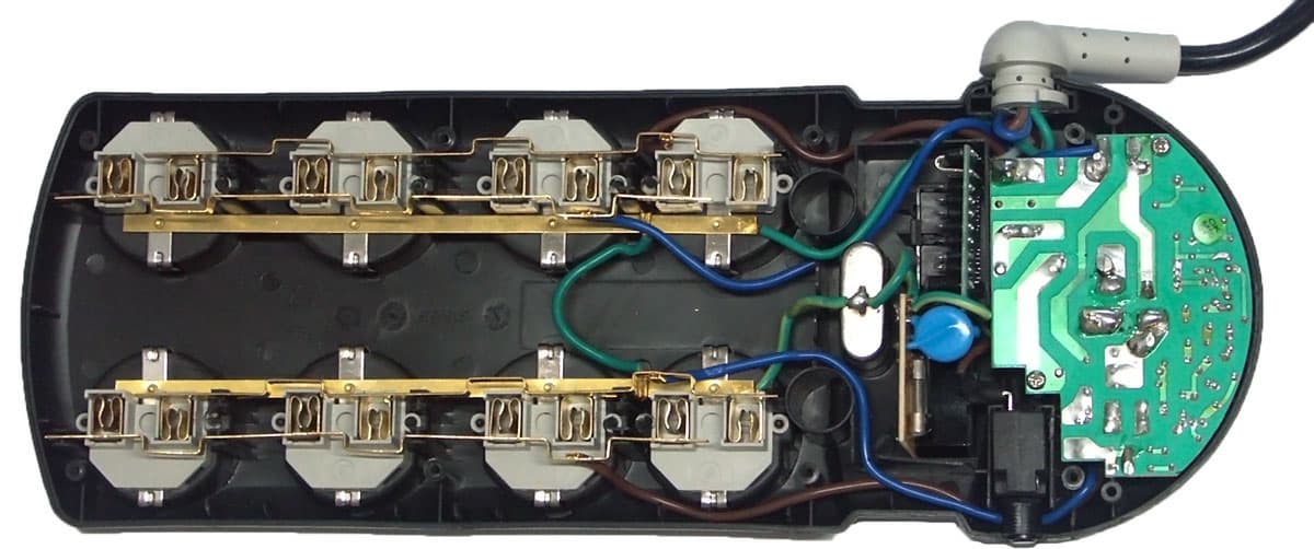 APC PF8VNT3-RS содержит 8 розеток по двум линиям питания. Конструкция, как самих розеток, так и контактов хорошая, контакты сложной формы хорошо пружинят для надежного удержания вилки.
