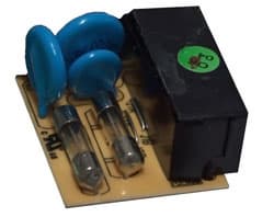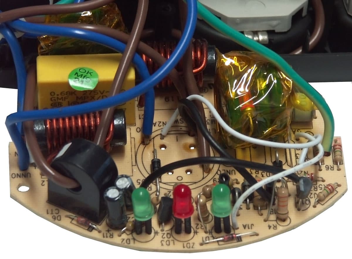 Печатная плата односторонняя, выполнена качественно, элементы на плате подписаны. Для подавления электромагнитных помех применен LC-фильтр. Для подавления всплесков напряжения, применяются варисторы и полупроводниковые элементы, заизолированные специальным материалом, вероятно, с целью недопущения "разлета осколков" в случае, если произойдет "перебор джоулей". Датчик перегрузки индукционный, что, с нашей точки зрения, является правильным решением, в отличие от резистора и замера потребляемой мощности по падению напряжения на нем.