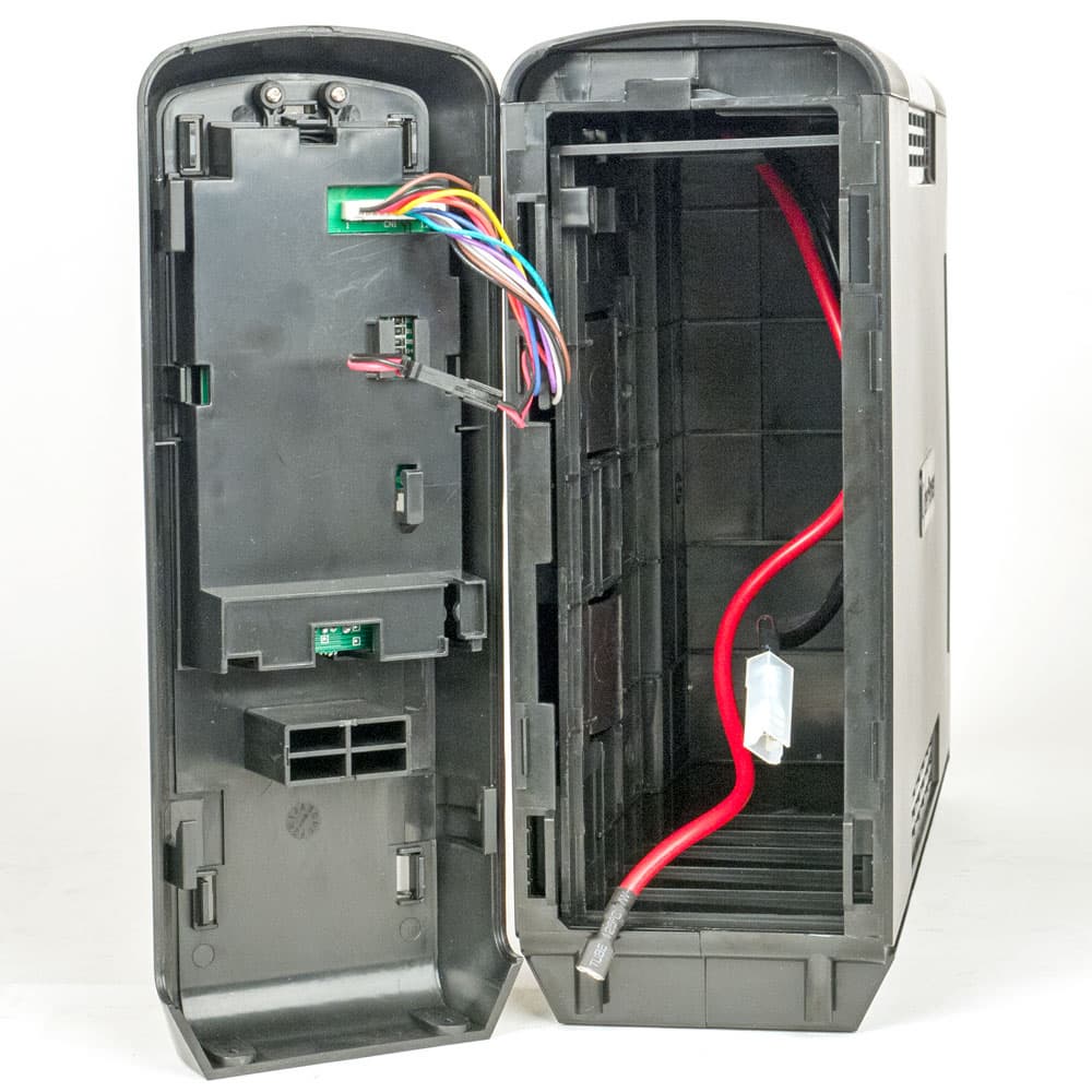 Проще всего добраться до встроенных аккумуляторов: надо лишь удалить два самореза на нижней грани лицевой панели, сдвинуть ее вниз, чтобы освободить фиксаторы, и снять. Правда, отложить ее в сторону помешают провода, идущие от панели управления, но они снабжены разъемами.