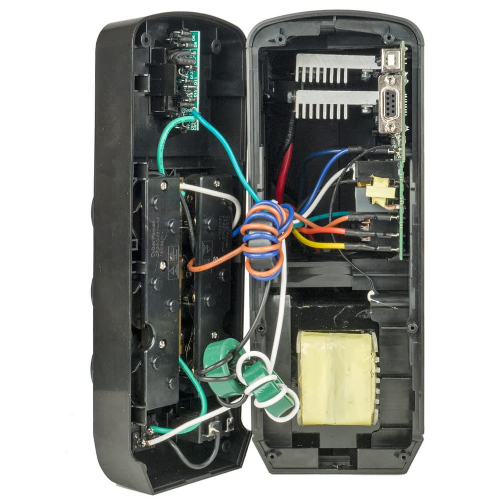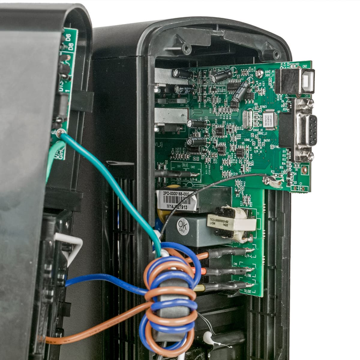 Вся электронная начинка сосредоточена в задней половине корпуса. Внизу бросается в глаза мощный и тяжелый трансформатор системы AVR. Над ним горизонтально закреплен вентилятор 80×80×15, поток воздуха от которого направлен вверх; работает он тихо и только при срабатывании AVR или при переходе на питание от батарей.