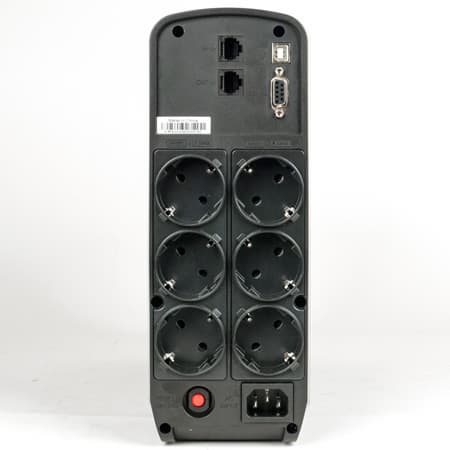 Больше половины площади задней панели занимают шесть розеток типа Schuko (с двумя боковыми плоскими контактами защитного заземления), размещенные в два ряда с поворотом контактов на 90°, чтобы можно было использовать Г-образные вилки. Причем все эти розетки задействованы в системе бесперебойного питания, то есть к ним не рекомендуется подключать нагрузки большой мощности или с большими пусковыми токами вроде лазерных принтеров. Отдельных розеток, предназначенных для подобной техники, в доставшемся нам экземпляре нет, хотя в интернете встречаются описания ИБП данной модели, у которых половина розеток подключена только к цепям фильтрации (с пометкой «Surge»), а другая половина — еще и к инвертору («Battery+Surge»).