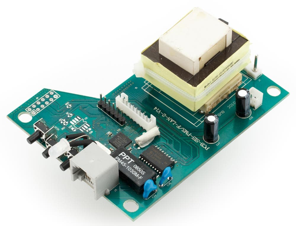 На слаботочной плате прежде всего замечаешь Ethernet-контроллер RTL8019AS; с обратной стороны расположился трансформаторный блок питания для схем управления, микроконтроллер Atmel MEGA-1284P, регистр-защелка 74HC573D (управляет оптронными ключами), тактовый генератор с кварцевой стабилизацией, а также LAN-разъем, кнопки и светодиодный индикатор. На плате есть и места под нераспаянные компоненты, включая коннектор; видимо, функциональность платы не ограничивается той, что используется в рассматриваемом фильтре.
