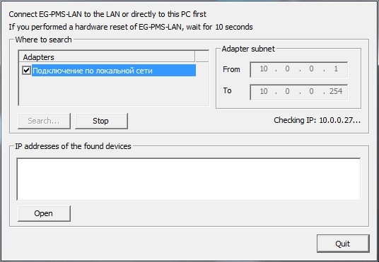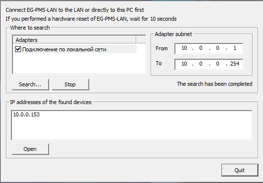 По окончании установки автоматически запускается утилита обнаружения фильтра — «Find EG-PMS-LAN» (конечно, впоследствии ее можно будет запускать и вручную).