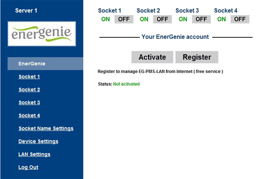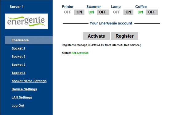 Теперь мы можем перейти к закладке «EnerGenie» и, нажимая «On» или «Off» для соответствующей розетки, проверить удаленное управление: