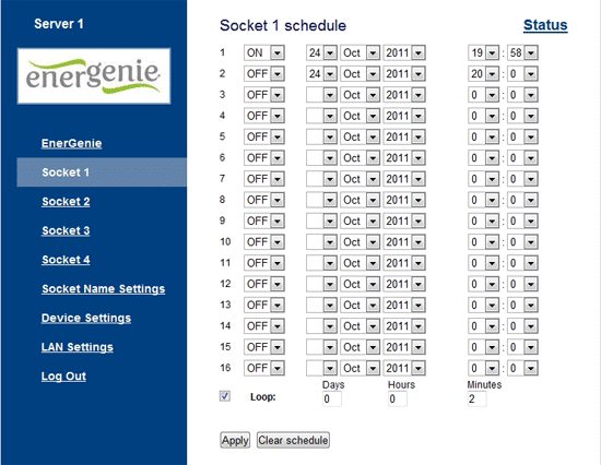 Перейдя по закладке с номером розетки («Socket1» — «Socket4»), можно начать программирование ее работы («Schedule»):