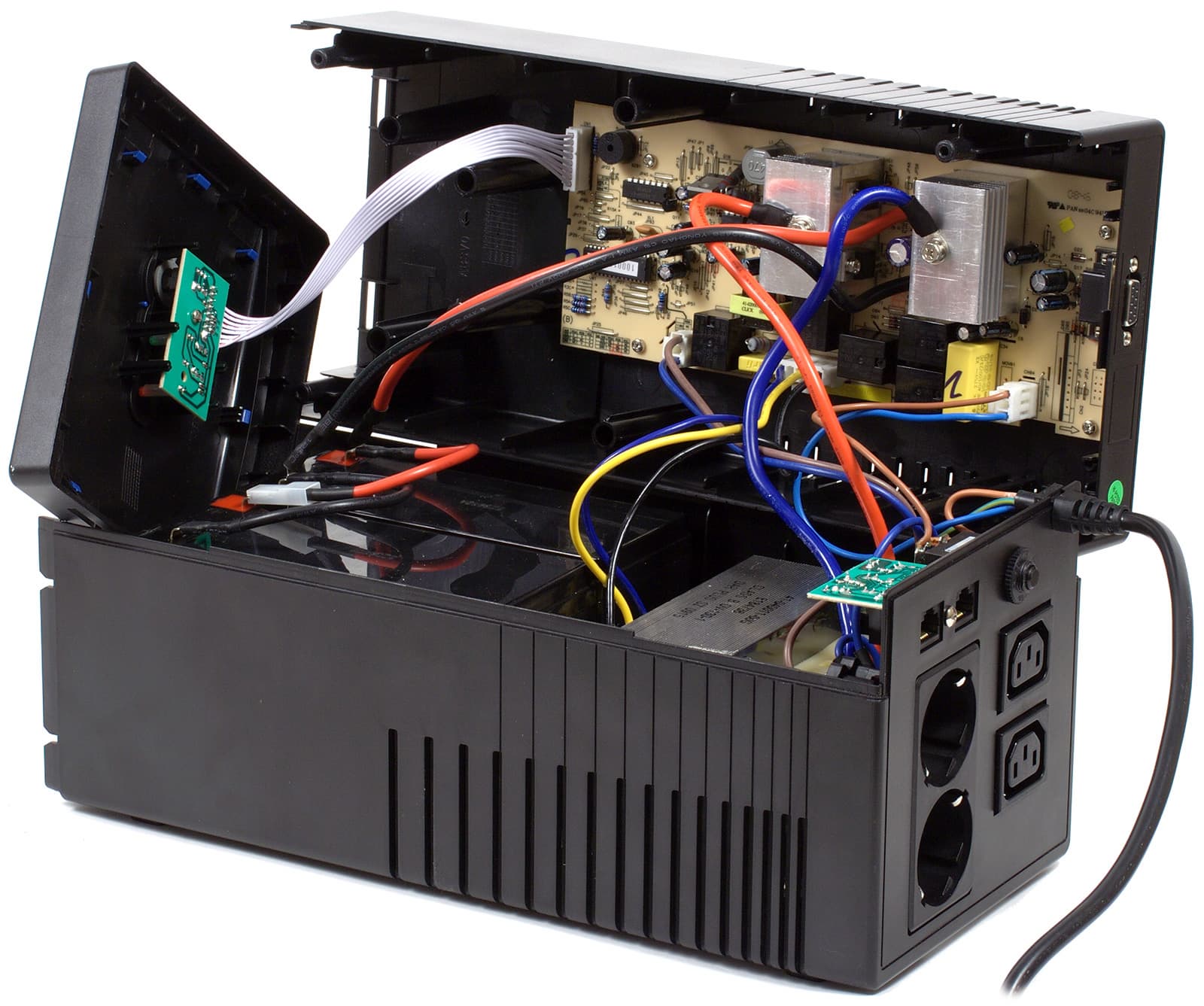 Компоновка ИБП стандартная: в верхней части находится плата электроники, а в нижней — батарея и трансформатор.