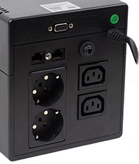 На задней панели находятся силовые разъемы: два IEC320 и два Euro/Schuko. Данное решение позволяет подключать различное оборудование без переходников. Судя по инструкции, также существуют версии этого ИБП с четырьмя одинаковыми разъемами. Кабель электропитания, длиной 150 см, не отстегивается. В верхней части имеется разъем RS-232 для подключения ИБП к компьютеру. Рядом с ним находится заглушка разъема USB, и, согласно инструкции, там должен быть этот порт, но его нет. На современных материнских платах порт RS-232 почти не встречается, так что подобная экономия неуместна. В средней части задней панели находятся разъемы RJ-45 и многоразовый автоматический предохранитель на 10 A.