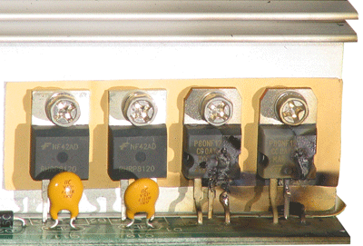 К сожалению, уже в конце тестирования, при попытке "холодного" старта с нагрузкой 1050 Вт, ИБП вышел из строя. Вскрытие показало разрушение двух STP80NF12, силовых транзисторов инвертора.