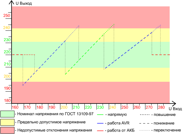 Тестируемый ИБП оснащен системой AVR — автоматическим регулятором напряжения, иногда называемого стабилизатором, который позволяет корректировать (повышать или понижать) входное напряжение, получаемое из электросети, не переходя на питание от батарей. Реализация данного модуля отличается в зависимости от модели и производителя, в данном случае AVR имеет одну понижающую ступень (для нормализации повышенного напряжения) и одну повышающую ступень (для нормализации пониженного напряжения питающей сети). Гистерезис AVR ~7В. Иллюстрирует работу AVR подробный график.