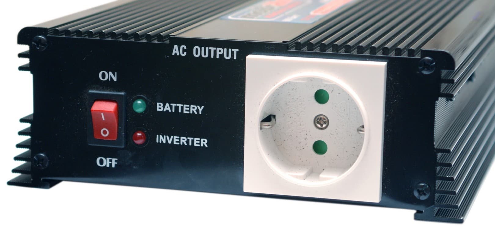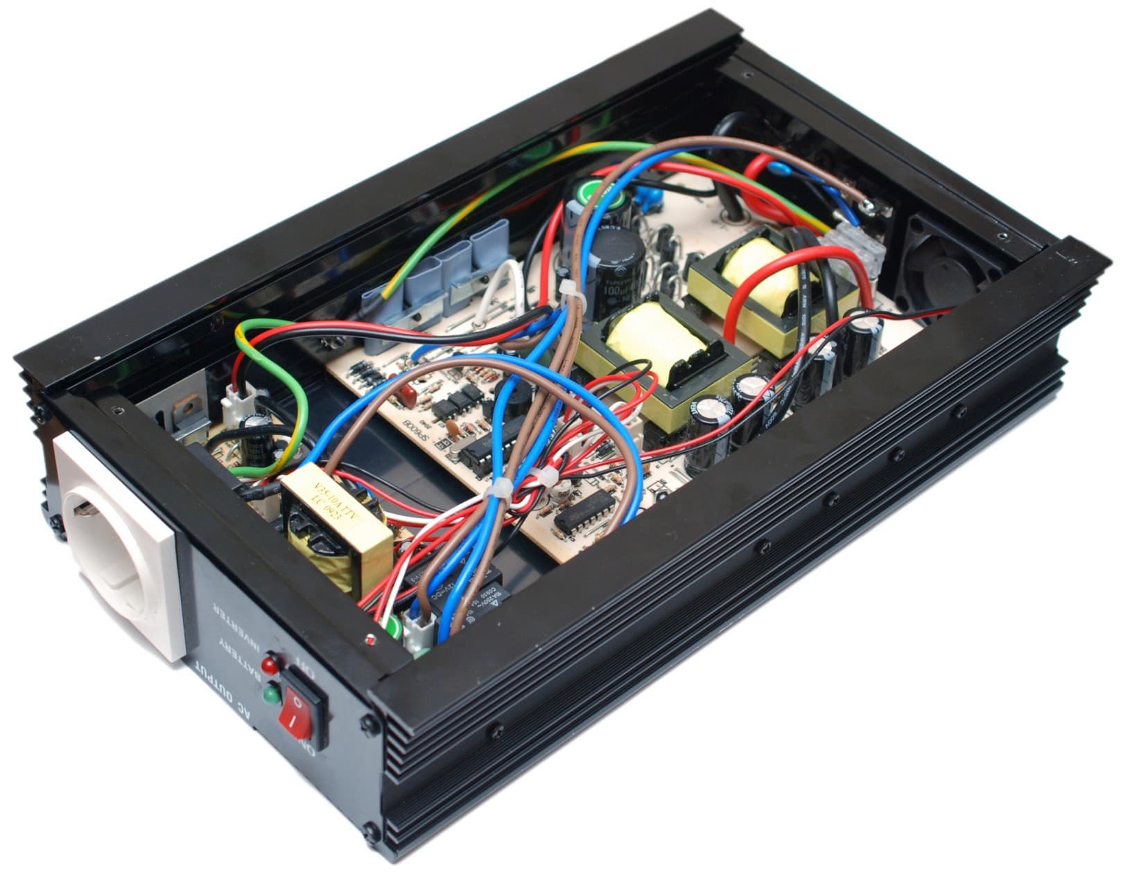 Металлический корпус кожуха служит также радиатором для отвода тепла от компонентов преобразователя. Высота устройства минимальная, если используется дома, может быть удобно приобрести электротехнический шкаф подходящего размера, где поставить вместе с аккумулятором.