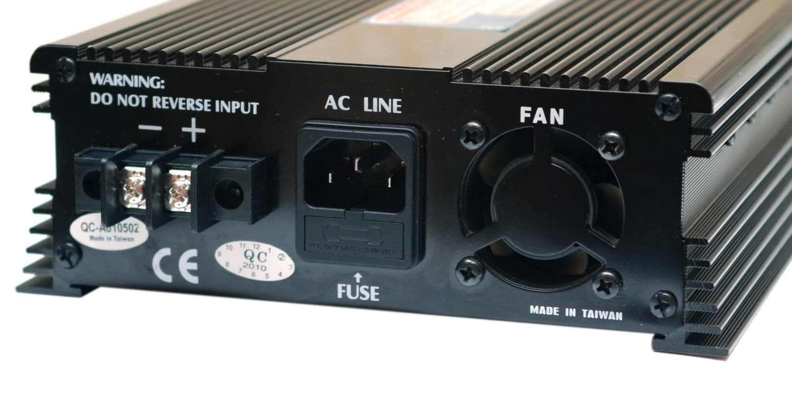 На задней панели: клеммы для подключения аккумулятора, вход сетевого питания с плавким предохранителем и 40-миллиметровый вентилятор.