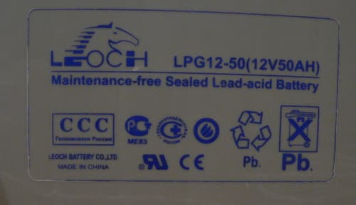 В нашем случае использовался недорогой гелевый аккумулятор китайского производителя Leoch из серии LPG емкостью 50 А•ч. Максимальный зарядный ток для такой батареи равен 15 А, а рекомендуемый 5 А, так что она вполне соответствует параметрам зарядного устройства.