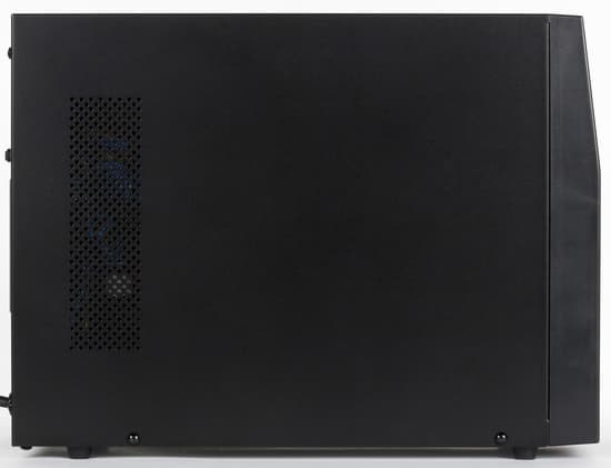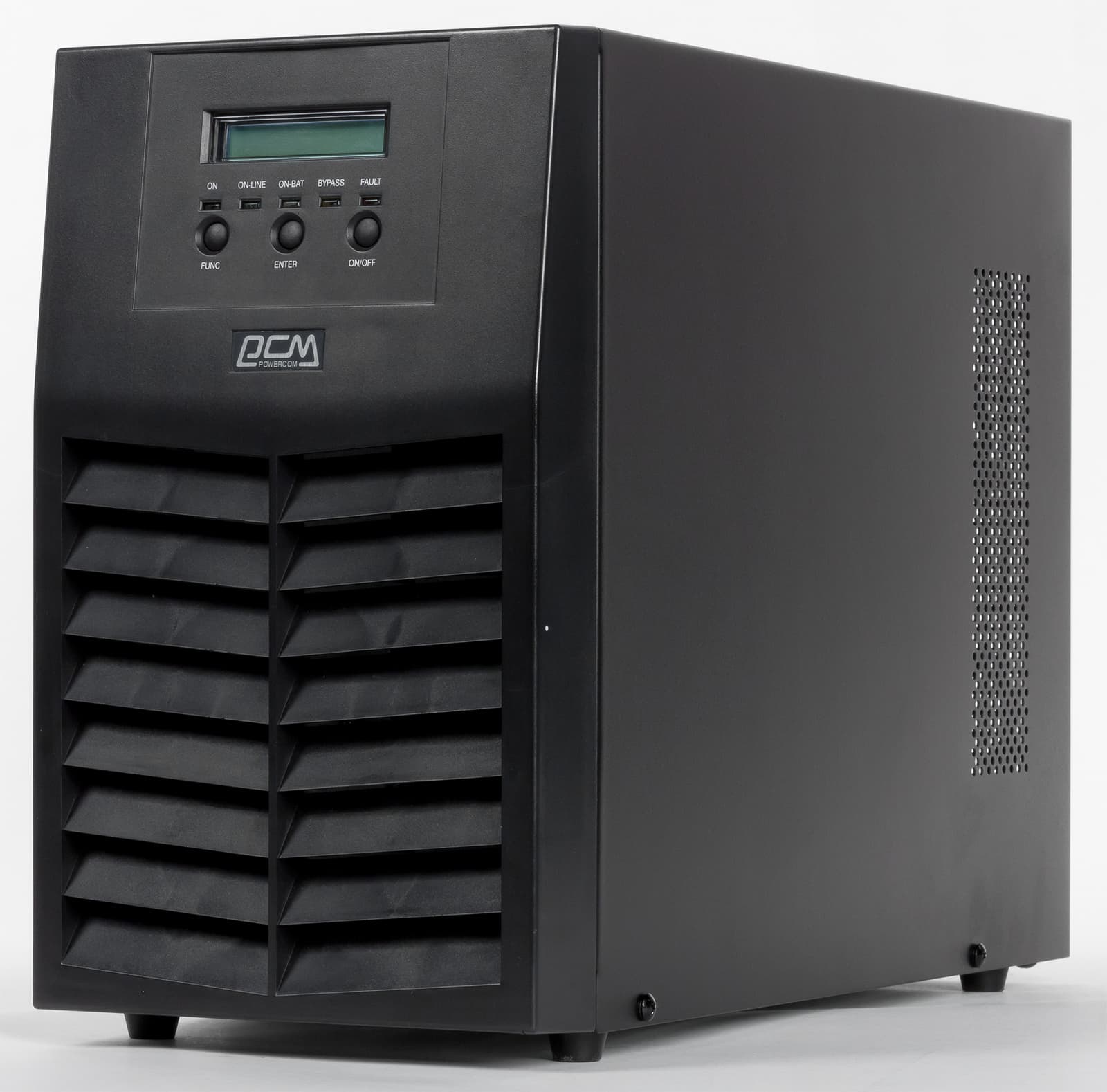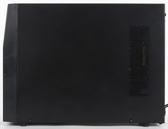Боковые стороны Powercom Macan MAS-3000 имеют перфорацию, которая необходима для вывода теплого воздуха из корпуса устройства. Вентиляторы охлаждения размещены за лицевой панелью справа. Стоит отметить, что охлаждают они только одну часть ИБП.